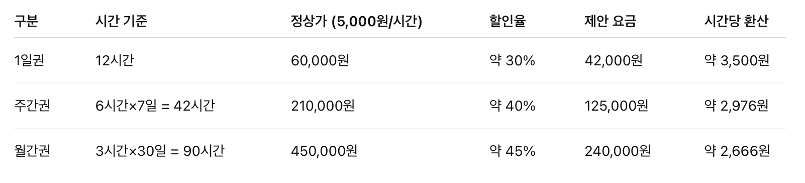※ 5월 14일 명칭이 어렵다는 의견이 있어 직관적으로 가격표 명칭을 업데이트 하였으며 8시간권과 심야 자유이용권이 추가 되었습니다.