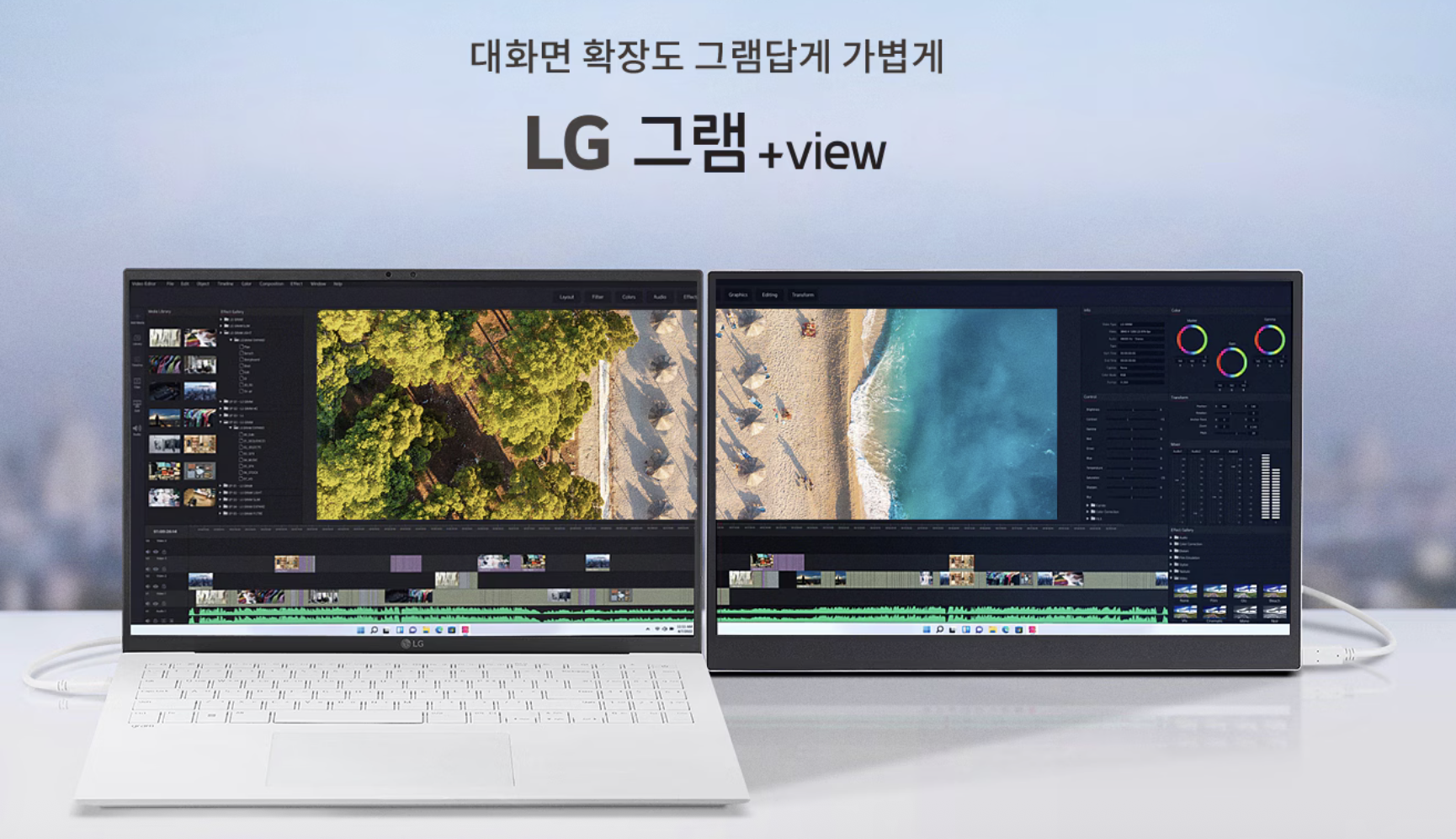 LG 그램뷰 포터블 모니터는 C Type 케이블로 노트북과 연결하여 듀얼 모니터로 사용 할 수 있습니다.
